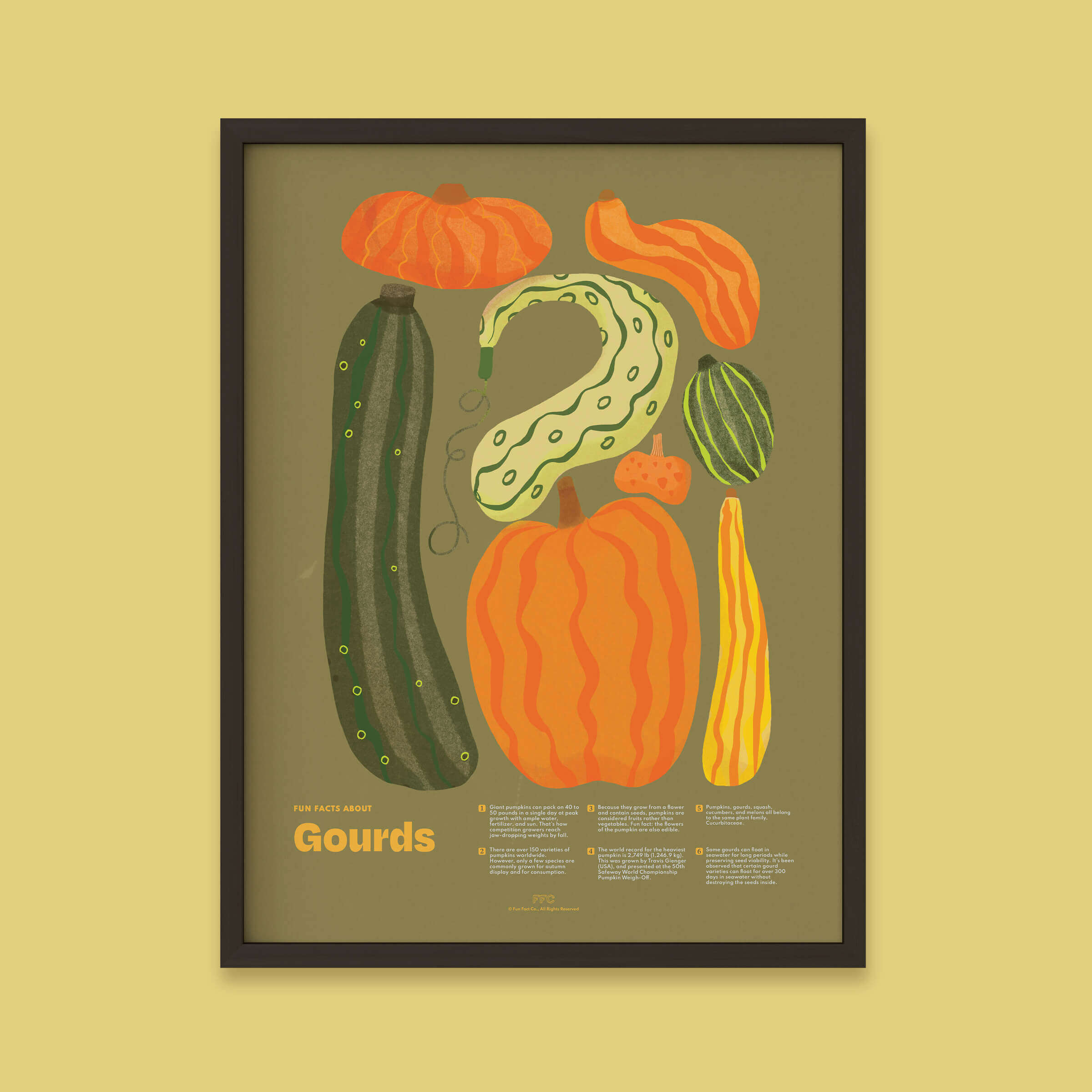 The Gourds Fun Facts Print is a beautifully hand-illustrated infographic that celebrates the wonderfully weird world of squash, pumpkins, and their quirky gourd cousins. Featuring varieties from the humble butternut to the bizarrely shaped crookneck, this educational art print pairs each gourd with fascinating facts that'll make you see your fall decorations in a whole new light. Did you know gourds have been used as everything from musical instruments to water containers for thousands of years, or that some varieties can grow over 500 pounds? With hand-drawn illustrations in warm autumn colors against an earthy olive background, this print brings an autumnal vibe to your kitchen, dining room, or classroom. Perfect for gardeners, food nerds, or anyone who's ever wondered if a cucumber counts (it does).